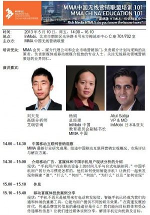 MMA中国无线营销联盟教育委员会发起的‘MMA中国无线营销教育培训101’第二期于5月10日在北京开课。第一次的培训课程4月24日在PPTV上海举行,吸引了超过70位的来自广告主,代理公司及无线营销的业界同仁报名参加。 点击下载培训课件 MMA中国无线营销教育培训101 第一期 详细