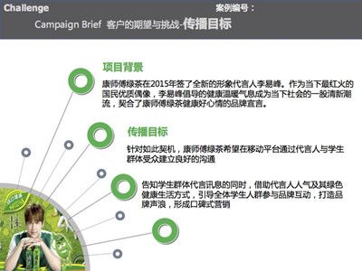 康师傅绿茶在2015年签了全新的形象代言人李易峰。作为当下最红火的国民优质偶像,李易峰倡导的健康温暖气息成为当下社会的一股清新潮流,也非常好地契合了康师傅绿茶健康好心情的品牌宣言。针对这样一个契机,康师傅绿茶希望在移动端通过李易峰的代言与他们最主要的消费人群之一——广大学生人群有更多更好的沟通,不仅要告知这一代言讯息,更希望由李易峰来倡导一个绿色健康的生活方式,引导全体学生人群来积极参与。