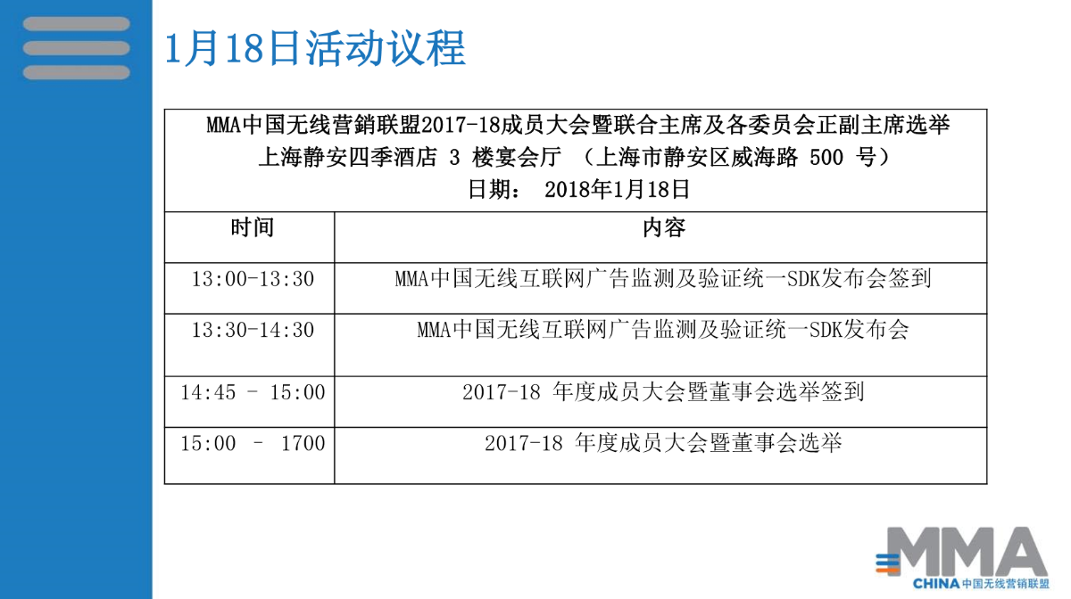 每家成员单位可以派出两位代表出席成员大会;每家成员单位有一张选票, 选出今届董事会和旗下4个委员会各席位。请于2018年1月12日或以前,以邮件回复确认大会出席代表的姓名、职务、联系方式(邮箱和手机)。邮件地址: marketing@mmachina.cn