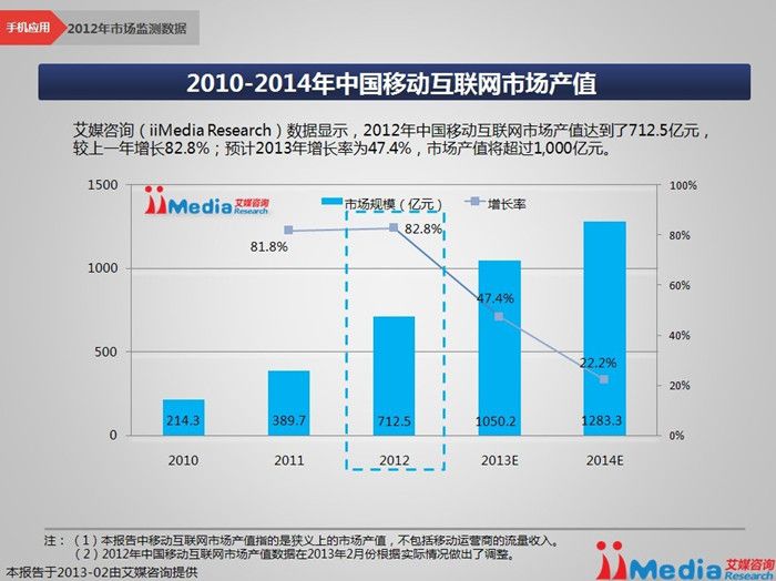 转载自:搜狐IT ( 6 ) 【搜狐IT消息】3月4日消息,根据艾媒咨询发布的《2012中国手机应用市场年度报告》显示,截止2012年12月底,中国手机网民规模已达到4.5亿人;中国智能手机用户数达到3.8亿人;中国移动互联网市场产值达到了712.5亿元,较上一年增长82.8%,预计