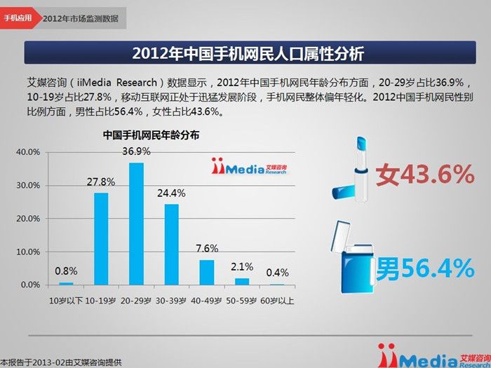 数据显示,2012年中国手机网民年龄分布方面,20-29岁占比36.9%,10-19岁占比27.8%,移动互联网正处于迅猛发展阶段,手机网民整体偏年轻化。2012中国手机网民性别比例方面,男性占比56.4%,女性占比43.6%。
