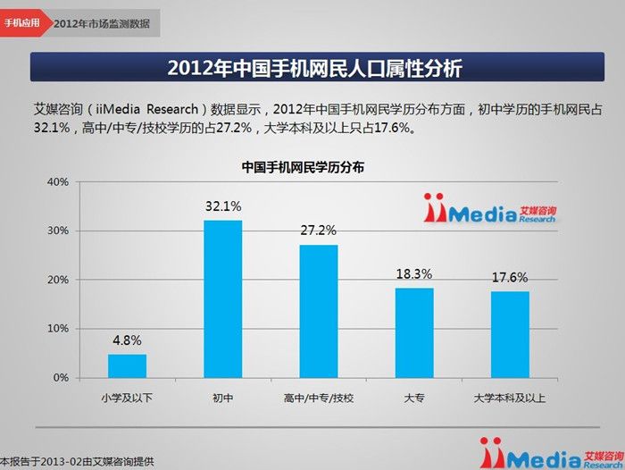 2012年中国手机网民学历分布方面,初中学历的手机网民占32.1%,高中/中专/技校学历的占27.2%,大学本科及以上只占17.6%。