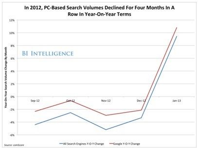 2012年,专门研究搜索引擎的分析师看到了从未见到的景象:来源于笔记本电脑和台式PC的搜索量同比连续四个月出现下滑。这种同比搜索下滑在2013年1月停止,当时PC的搜索量同比突然上升。(下图)