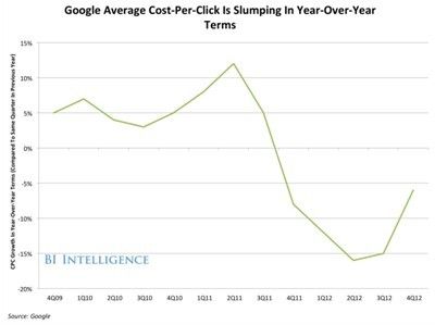 谷歌和其他搜索引擎不能像在台式机和笔记本电脑上那样,要求相同的每次点击成本(CPC)。理由在于:移动搜索很难追踪用户点击的价值,因为智能手机用户时常在旅途中搜索,并离线完成购买,或在其他设备上购买。这就解释了为什么自2011年末以来,谷歌的CPC季度同比呈现负增长,因为便宜的移动点击拖累了广告价格。