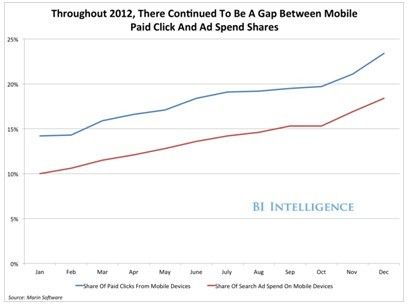 3、根据马林软件的说法,移动占到搜索广告点击的四分之一,但广告花费方面少于五分之一。