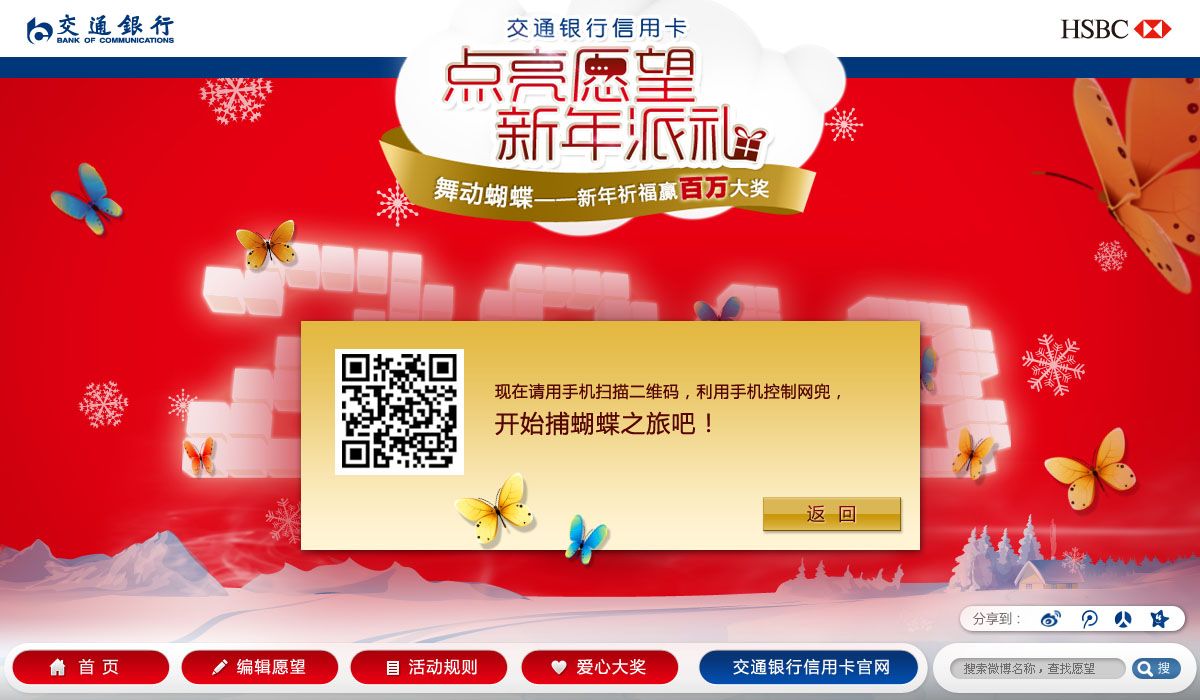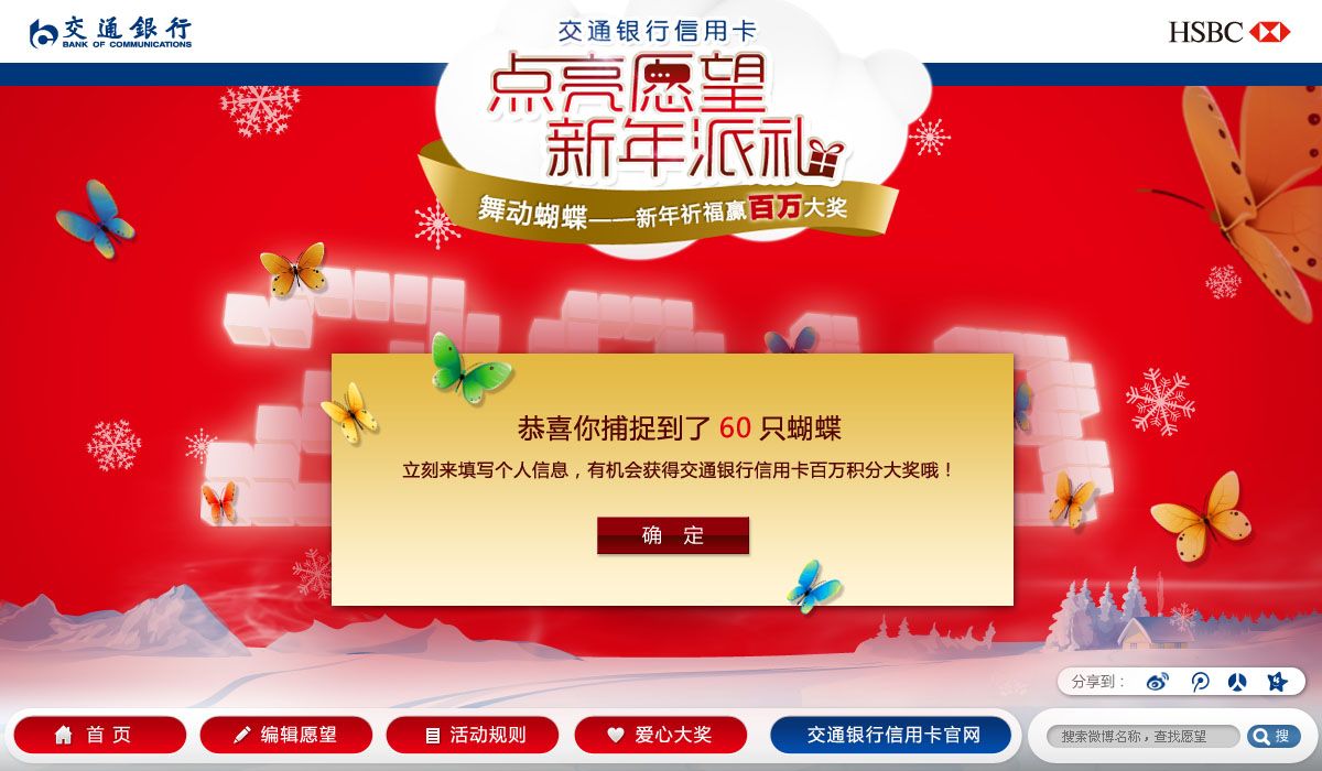 分享微博成功,代表新年愿望的蝴蝶翩翩飞舞 完成送祝福活动,填个人信息,参与抽奖