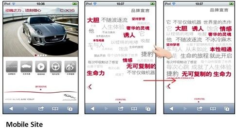 案例名称:Jaguar Alive Campaign案例制作公司:mJoule涉及品牌: Jaguar 项目背景及目的宣传品牌项目需要解决的问题打造新车上市知名度,收集潜在用户投放周期2012年3月19日-5月2日 项目内容手机凤凰网+手机/Pad in-app广告;移动媒体广告带入Html5 网站 供应商名称Madhouse/Adchina/手机凤凰网项目/调研主要发现1.针对目标人群的广告有效性:挑选针对目标受众的广告载体,如新闻、财经、汽车、工具类APP,抓住目标受众2.广告创意评估:借助H5技