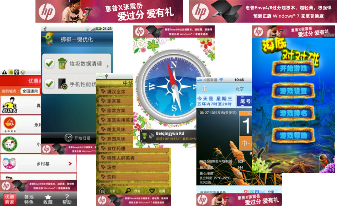 HP暑期促销期间,以张震岳为代言人开展活动,通过制作HTML5的手机网站,引导用户参与“岳”近大挑战及晒单赢大奖互动,利用新浪微博、腾讯微博、人人网 三大SNS平台扩大传播范围