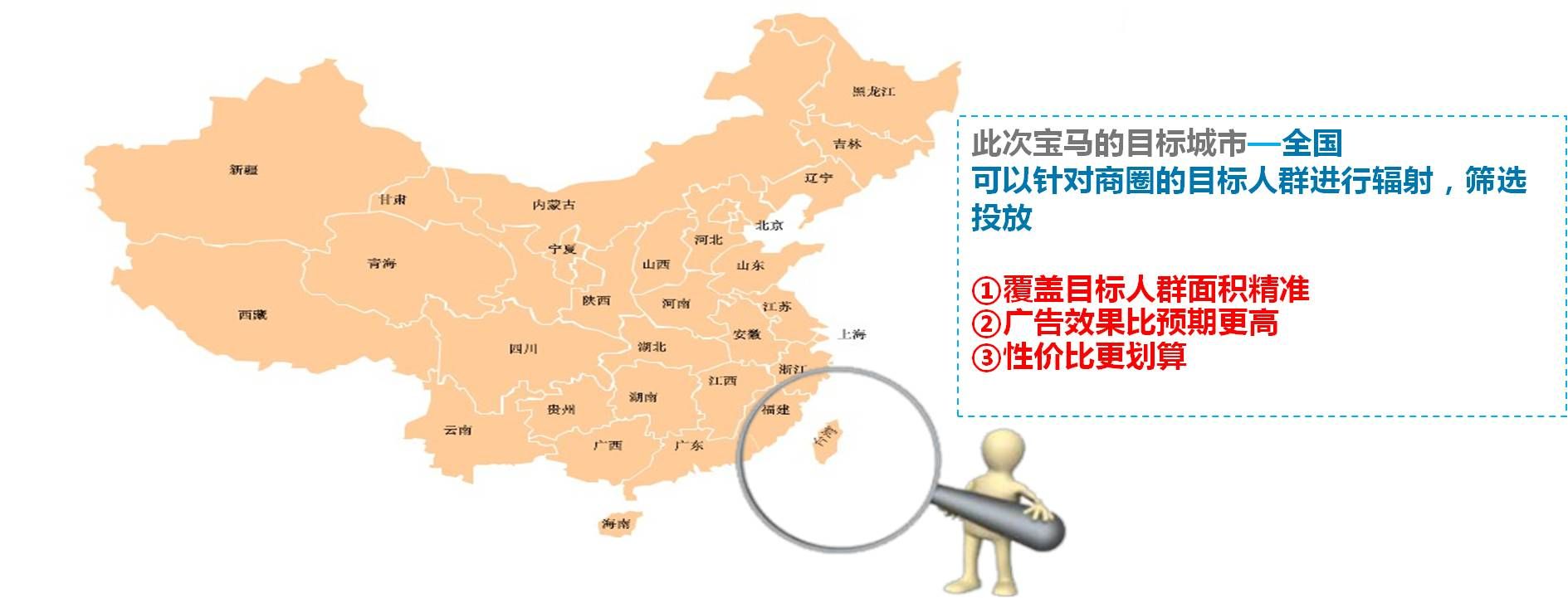 力美LBS定向覆盖全国500个城市中进行目标城市定向,重点选择偏好宝马受众群体的一二线城市及中东部主要省会城市作为主要目标区域。