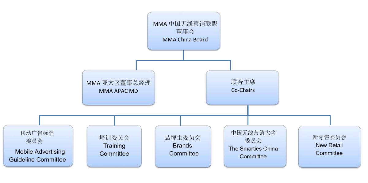 中国无线营销联盟理事会由四部分组成:联合创始人,常任理事,联合主席,委员会正副主席。该理事会的责任是与MMA亚太区董事总经理合作,共同制定MMA中国无线营销联盟的长期发展策略。