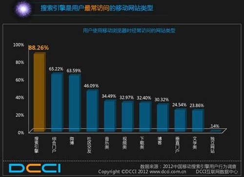 DCCI:移动搜索渗透率最高转载自:DCCI1月25日,DCCI互联网数据中心发布《2012年中国移动(微博)搜索市场研究报告》显示,移动搜索的市场整体渗透率上升势头强劲,在最常使用移动网站及最常使用的移动APP调查中,移动搜索均排名首位,成为普及率最高的移动互联网应用。 报告指出,移动互联网时代,用户主要通过访问移动网站、直接调用APP两种方式冲浪移动互联网,而无论是直接访问移动网站,还是使用APP,移动搜索的市场渗透率均排名首位。报告数据显示,通过移动浏览器使用移动搜索服务的用户市场渗透率高达88. 详细