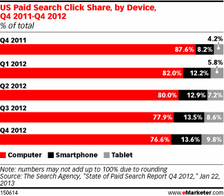 【搜狐IT消息】根据eMarketer的报告显示,在去年第四季度,有四分之一的付费搜索广告来自智能手机和平板电脑——这相比2011年同期增长了一倍。其中平板电脑的增长尤为显著,已经占据了将近10%的市场份额。
