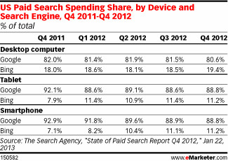 转载自:搜狐IT【搜狐IT消息】根据eMarketer的报告显示,在去年第四季度,有四分之一的付费搜索广告来自智能手机和平板电脑——这相比2011年同期增长了一倍。其中平板电脑的增长尤为显著,已经占据了将近10%的市场份额。 ( 1 )   在广告收入方面,谷歌依然牢牢掌握着领先优势。在
