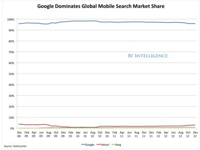 根据市场调查机构comScore的数据,谷歌在美国台式机和笔记本电脑搜索市场占到67%。在移动领域,根据市场调查机构StatCounter的数据,谷歌占据绝对的统治地位,占到了全球搜索查询的95%。