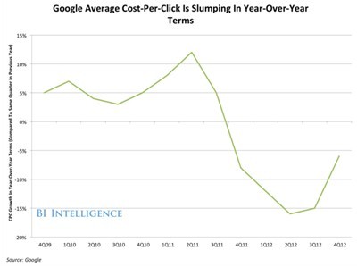 谷歌和其他搜索引擎不能像在台式机和笔记本电脑上那样,要求相同的每次点击成本(CPC)。理由在于:移动搜索很难追踪用户点击的价值,因为智能手机用户时常在旅途中搜索,并离线完成购买,或在其他设备上购买。这就解释了为什么自2011年末以来,谷歌的CPC季度同比呈现负增长,因为便宜的移动点击拖累了广告价格。
