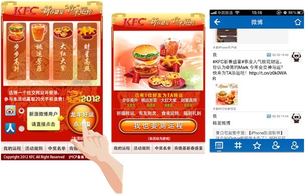 案例名称:肯德基新年产品促销案例制作公司:mJoule涉及品牌: 肯德基 项目背景及目的产品新年促销项目需要解决的问题如何巧妙结合中国人农历新年的大氛围,为产品做促销投放周期2012年1月10日-1月30日项目内容手机in-app广告;移动媒体广告带入Html5 网站项目调研主要发现1.针对目标人群的广告有效性:利用社交网络登陆精准定位目标人群,同时进行优惠券下载,运程查询,分享等吸引目标受众2.广告创意评估:用查看“龙年运程”的方式巧妙结合农历春节,非常出彩 案例创意