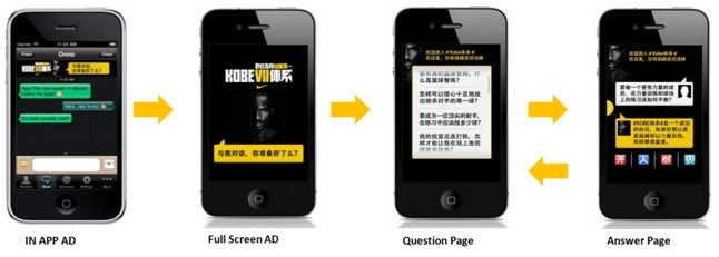 案例名称:NIKE KOBE VII System Campaign案例制作公司:mJoule涉及品牌: NIKE 项目背景及目的宣传NIKE KOBE VII System新款上市项目需要解决的问题配合新款上市,增加全媒体投放的趣味性投放周期2012年1月20日-1月23日项目内容手机portal+手机/Pad in-app广告;富媒体Html5 banner带到互动页面项目调研主要发现1.针对目标人群的广告有效性:挑选针对目标受众的广告载体,如体育,游戏类APP,抓住目标受众2.广告创意评估: