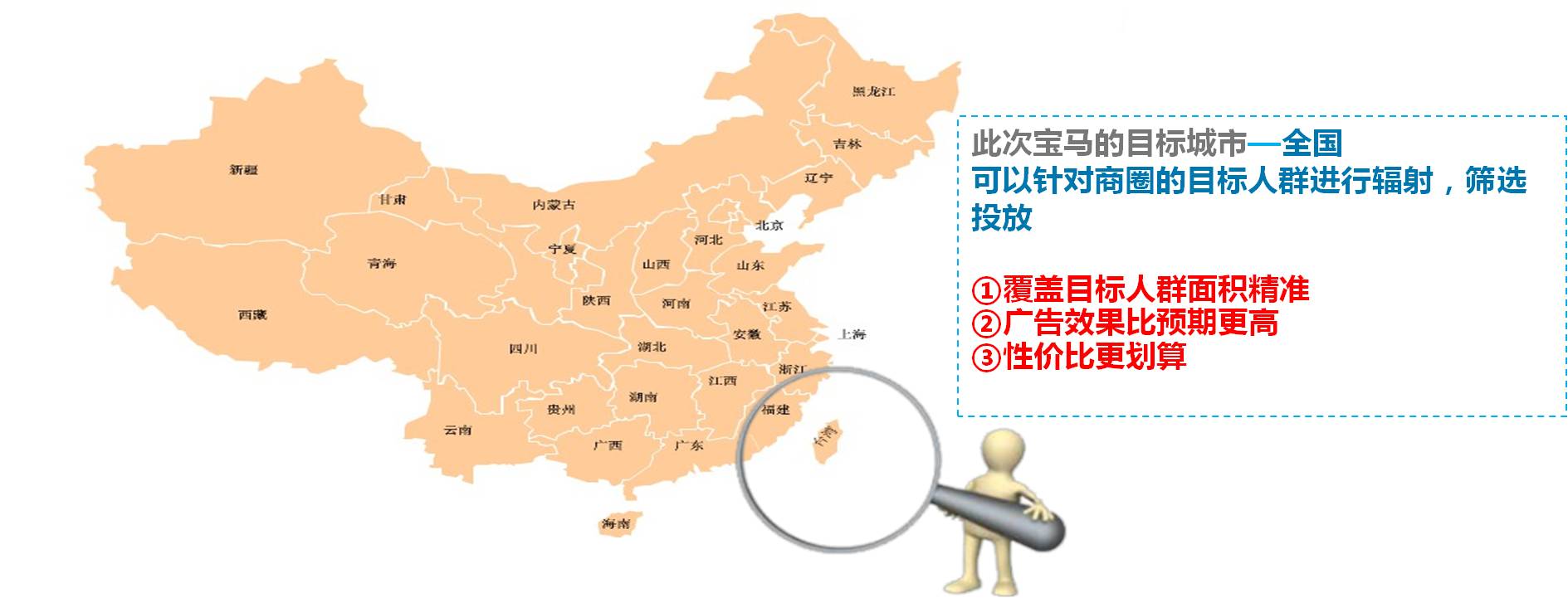 力美LBS定向覆盖全国500个城市中进行目标城市定向,重点选择偏好宝马受众群体的一二线城市及中东部主要省会城市作为主要目标区域。