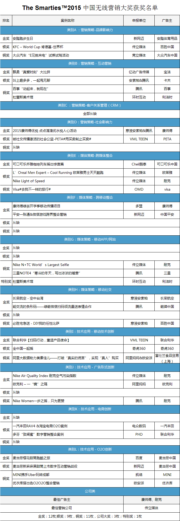 (2015年8月14日,上海)——2015年度MMA无线营销大奖 (The Smarties™) 的终审结果今日在上海揭晓,共评选出金奖12枚,银奖9枚,铜奖11枚,公司大奖3枚和特别奖1枚。